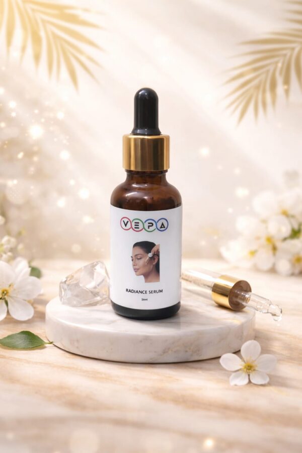Unlock your skin’s natural brilliance. VEPA Radiance Serum is a potent, lightweight formula designed to illuminate dull skin, even out tone, and provide a “lit-from-within” glow. Housed in a premium amber bottle with a precision gold dropper, it’s the ultimate liquid gold for your skincare routine.